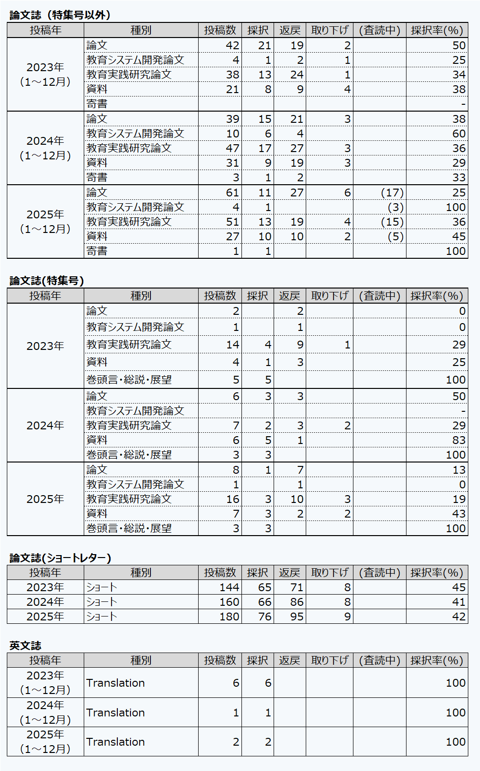 論文誌投稿数と採択率 投稿数と採択率 本学会の論文誌,英文誌に投稿されました論文の数と採択率を以下に示します. 投稿規程 執筆の手引 投稿手順 査読者一覧 論文賞・研究奨励賞 特集号 ショートレター 投稿数と採択率 著作権規程