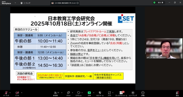 研究会一般開催報告 開催報告 2025/11/12 研究会の開催報告 ●日時:2025年10月18日●会場:オンライン(Zoom)●発表件数:31件(内非会員12件)●参加者数:104名(内非会員22名) 今年度第3回目の研究会を完全オンライン(Zoom)の形式で開催しました。研究会は年に一度、完全オンラインでの開催を継続しています。テーマは一般のみとして、31件の研究発表が行われました。当日の参加者は104名でした。 対面とオンラインのハイブリッド形式で開催する行事が定着した一方で、運営のための機材や人員の確保に課題があることも確かです。対面での議論にオンライン参加者がうまく入ることが難しく、ともすれば「オンライン参加者そっちのけでの進行」となってしまう場面を見かけることもあります。 完全オンラインの回ではそのようなこともなく、円滑な発表と議論を進めることができました。何より、参加者の方々の積極的な発言のもと、対面での開催と変わらず活発かつ温かい研究会となりました。投影資料の見やすさや字幕の自動付与などの機能を生かすだけでなく、ウェブ会議システムにおけるAIの進化なども取り入れた運営を今後検討していきたいと考えております。 ご参加いただきました皆様、快く座長を引き受けてくださった皆様、および開催のためにご協力いただいた皆様に御礼申し上げます。ありがとうございました。 担当:江木啓訓(電気通信大学)